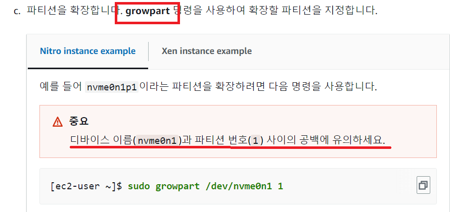 > sudo growpart [디바이스 이름] [파티션 번호]