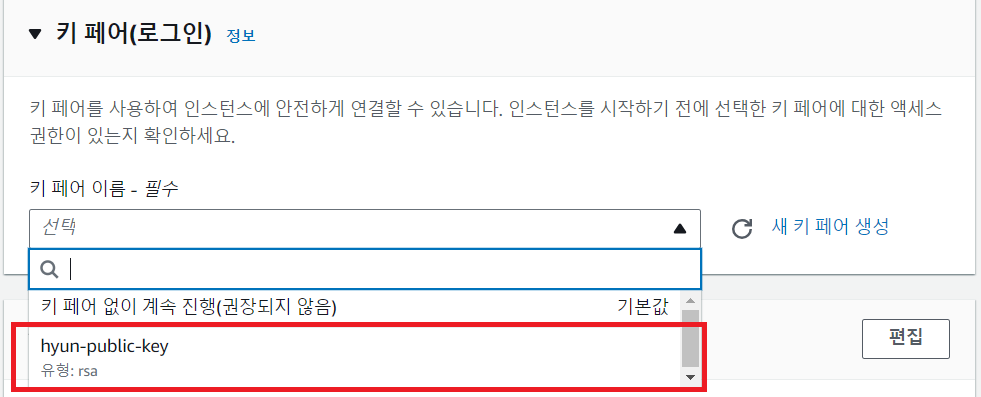 키 페어 등록할 때 내가 등록한 키 페어를 사용할 수 있다.