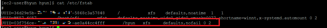 > uuid [마운트할 디렉터리] xfs default,nofail 0 2