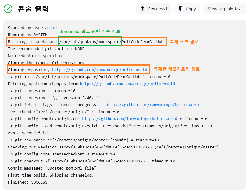빌드 시작을 누르고 빌드가 완료되면 Console Output에서 리포지토리가 복제된 위치를 확인할 수 있다.