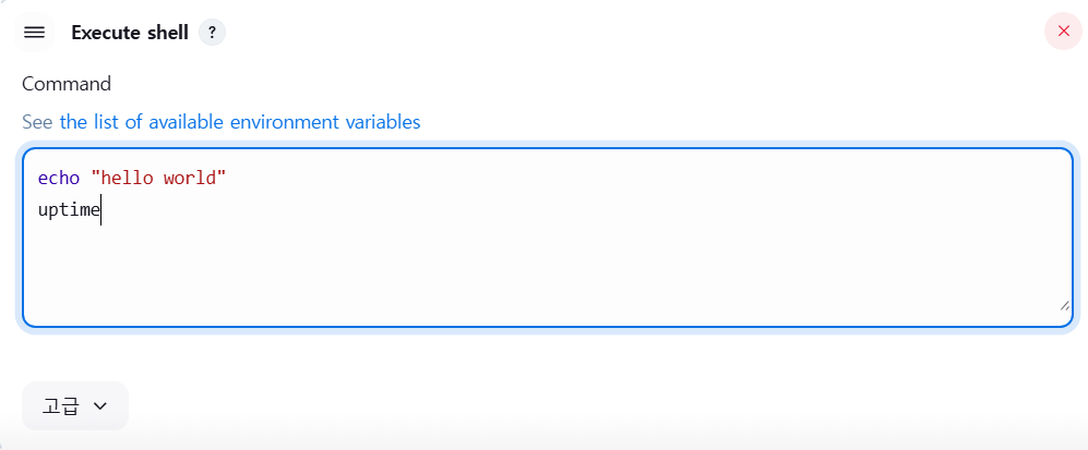 현재 실습 환경에서는 Linux를 사용하고 있기 때문에 Execute shell을 선택해주고 빌드할 때 실행할 명령어를 작성한다.