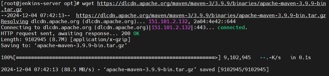 jenkins server 터미널로 가서 /opt 디렉터리 진입하고 wget 명령을 사용하여 파일을 다운로드한다.