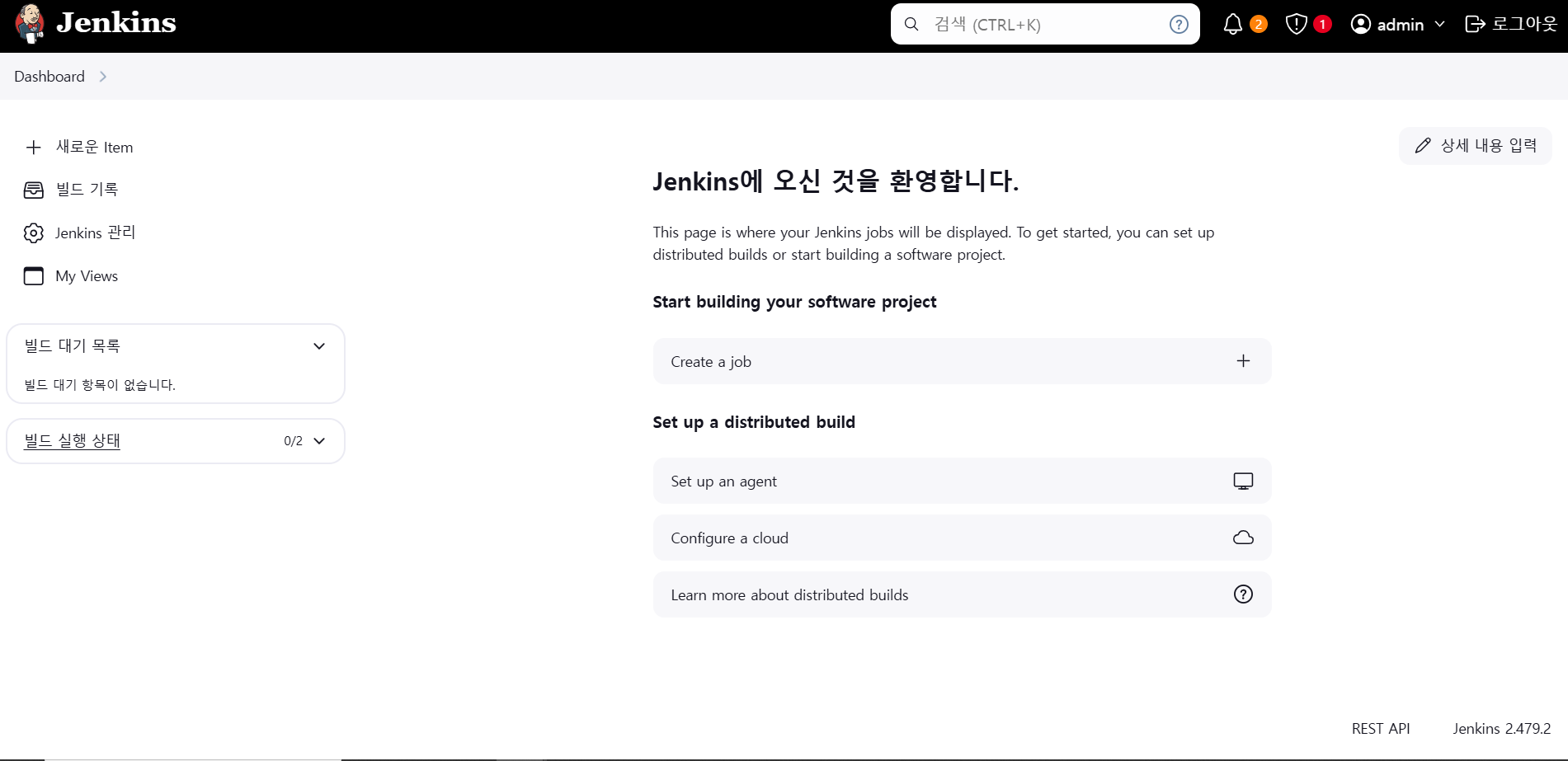 Start using Jenkins 버튼을 누르면 젠킨스의 메인 화면이 뜰 것이다.