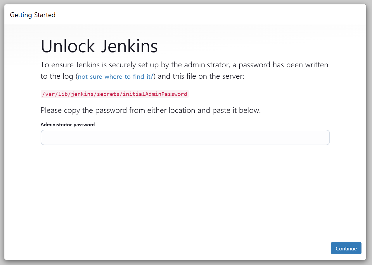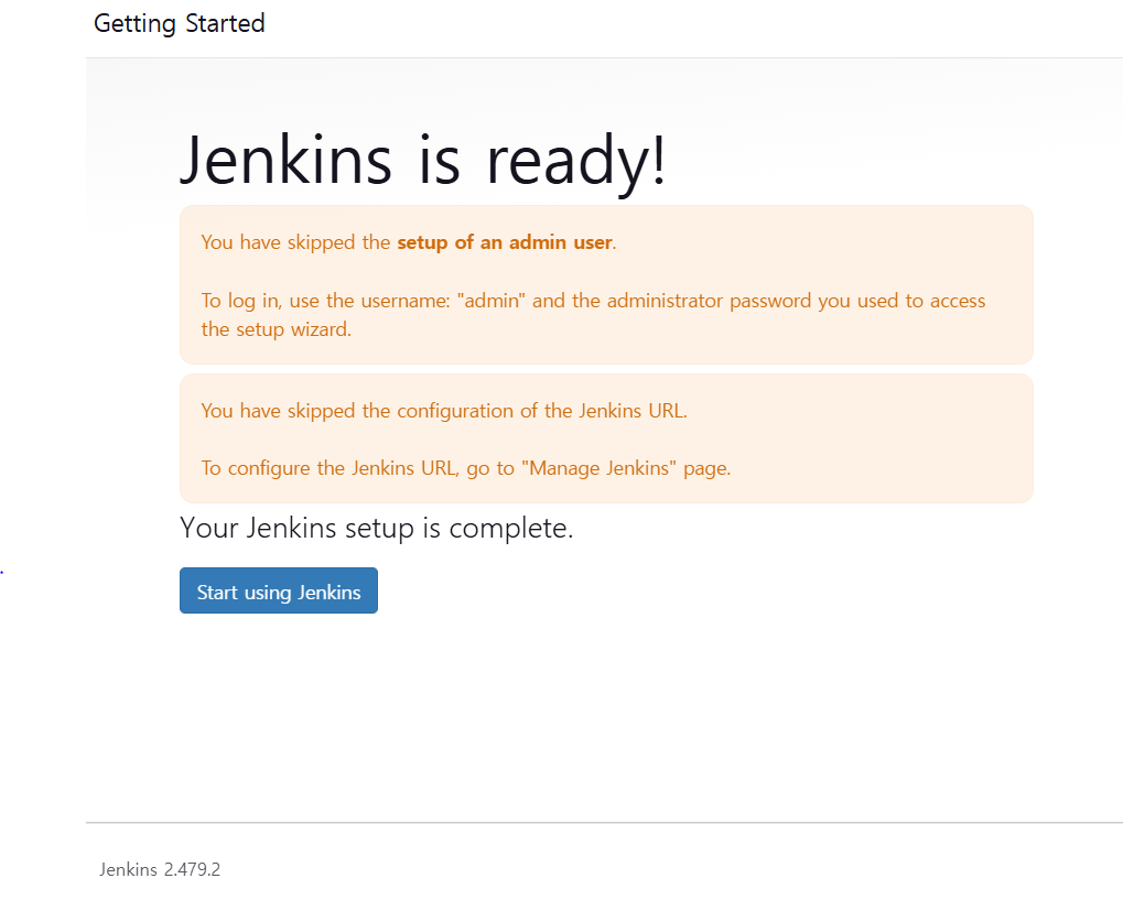 이제 젠킨스 서버를 사용할 수 있는 모든 준비가 되었다는 화면이 뜬다.