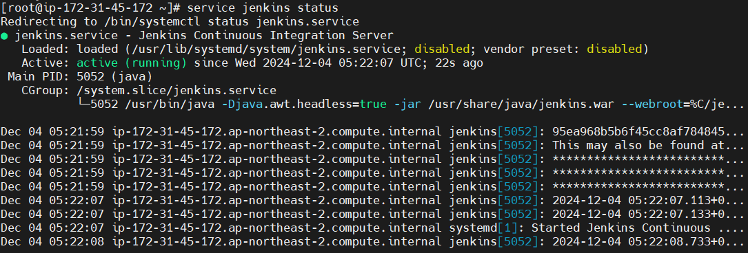 service jenkins start 명령을 입력하고, service jenkins status 명령을 이용하면 서버가 활성화되는 것을 확인할 수 있다.