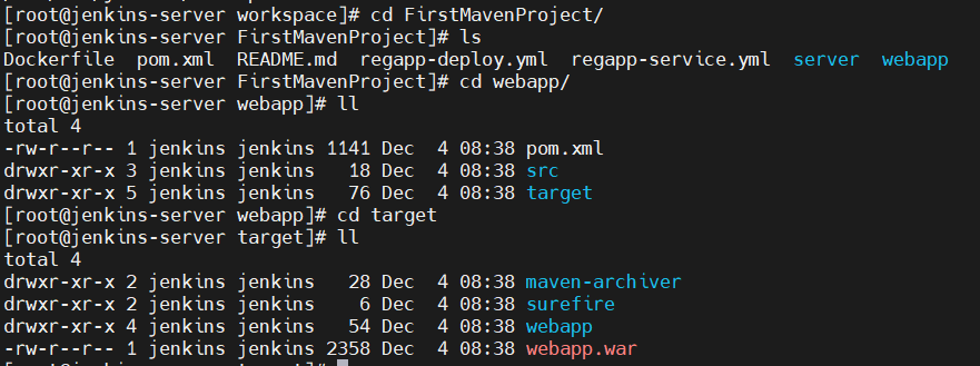 빌드가 무사히 완료되면 /var/lib/jenkins/workspace에서 프로젝트를 확인할 수 있다.