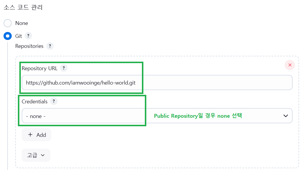 * git 리포지토리가 public일 경우에는 Credential을 추가할 필요가 없다!