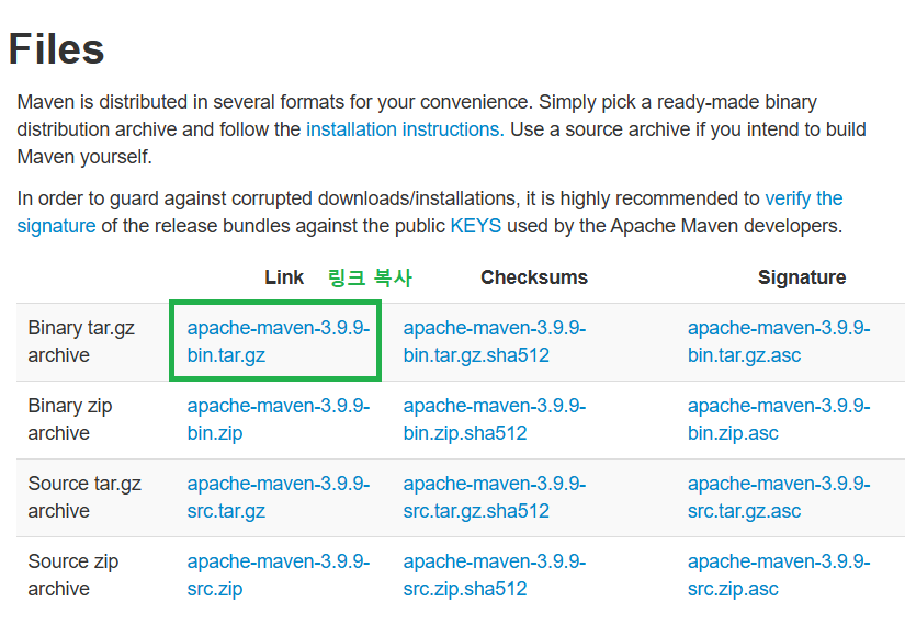 Binary tar.gz archive에 커서 대고 마우스 우클릭 후 Copy link address