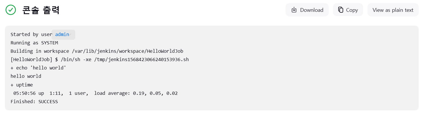 젠킨스가 제대로 빌드되었을 경우 uptime 명령이 실행되도록 설정했기 때문에 아래와 같은 내용이 출력되어야 한다.