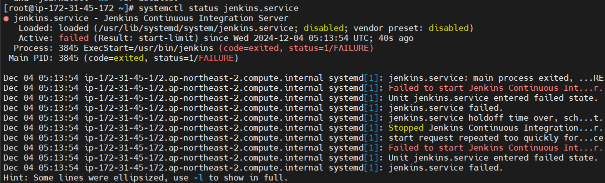 inactive(dead)일 경우 service jenkins start 명령을 이용한다.