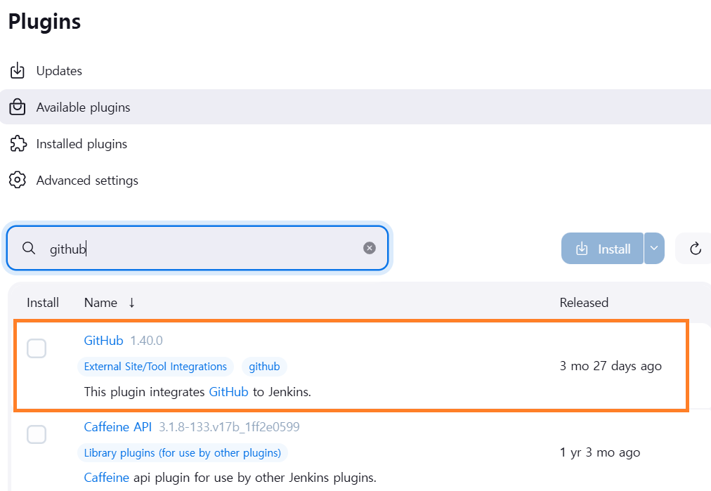 Manage Jenkins(Jenkins 관리) - Plugins - Available plugins - github 검색 후 install을 클릭한다.